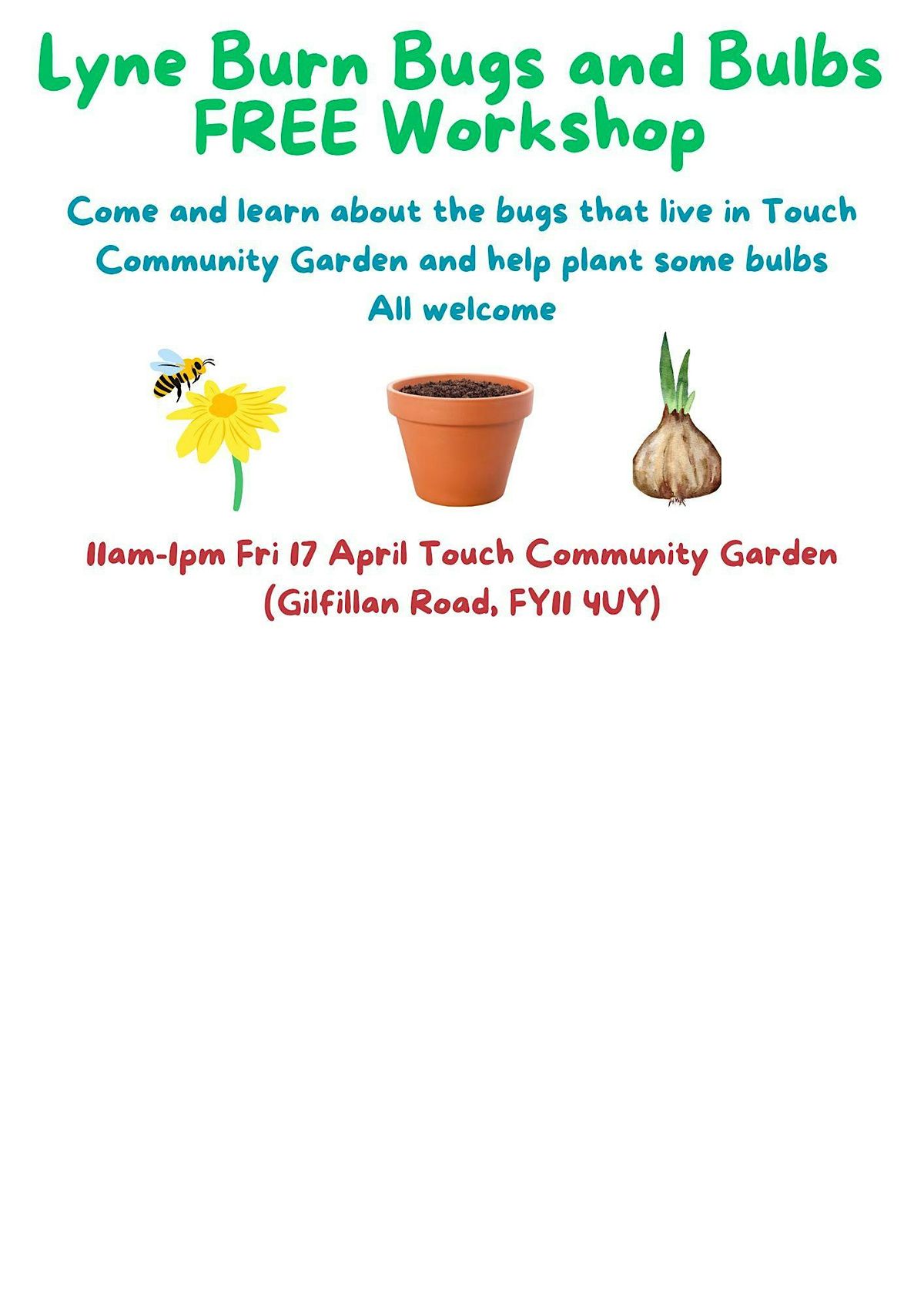 Join us for a FREE family workshop at Touch Community Garden from 11am-1pm. Learn about the bugs and beasties that live in the community garden, help us plant native bulbs, and enjoy some lunch. Children must be accompanied by a responsible adult (please book tickets for everyone attending so we know numbers).