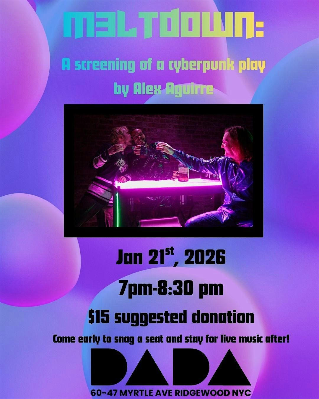 Join us for a special screening of M3LTD0WN, an interdimensional cyberpunk comedy influenced by Y2K aesthetics and 90s rave culture. The film follows two parallel Earths on a collision course as a cosmic event known as quantum cannibalization threatens to erase one of them entirely.