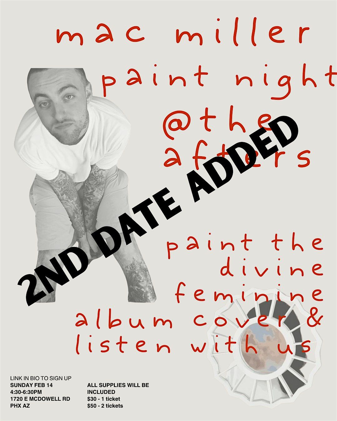 Added another date! Feb 14th. 4:30-6:30pm. At the afterparty. all supplies included.