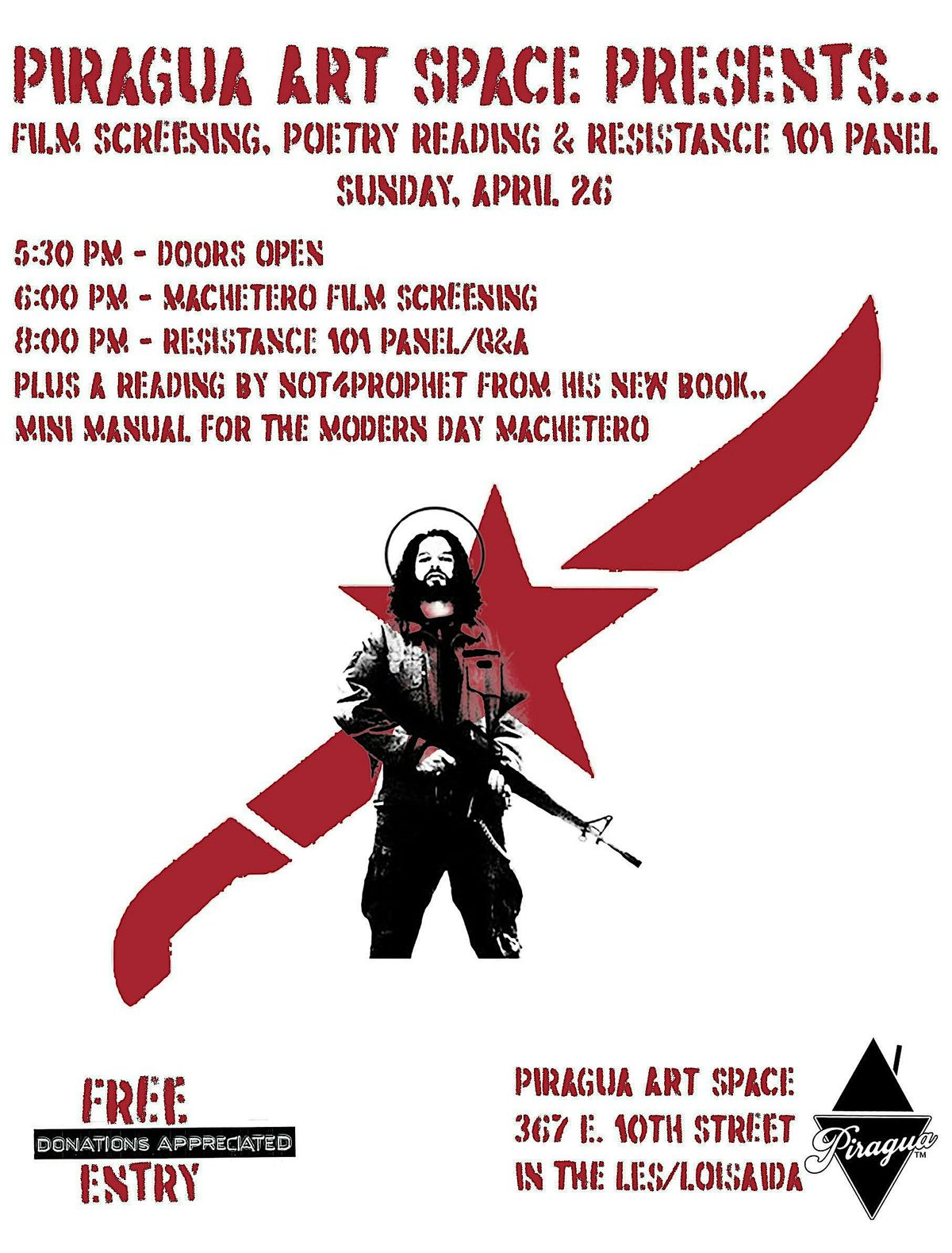 This gathering will explore resistance, identity, radical struggle, art as activism, and the enduring spirit of those who dare to challenge power. The evening will also feature a live reading from Not4Prophet's new book, Mini Manual for the Modern Day Machetero.