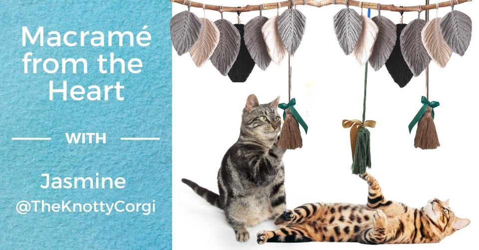 Join us, and the adorable, adoptable cats of The Dancing Cat, as we take up a new hands-on (without needles or hooks) creative class - macramé! An art with a history stretching as far back as the Babylonions -- macramé is a fiber art made with knotwork, rather than weaving or knitting. In this workshop, you will receive hands-on instruction and be guided through several essential macramé knots as you create two lovely cat-toy-ready creations; a foundational-knot tassle and a more elaborate leaf. You will also get a macramé knot guide, written instructions, enough materials for a second project at home, and a source guide to take with you.