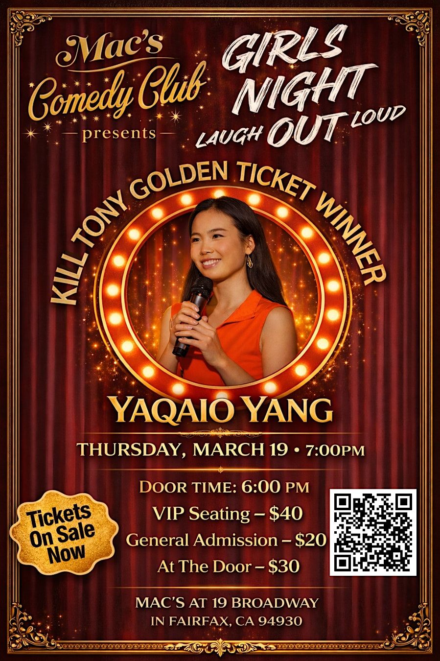 Mac’s at 19 Broadway is excited to announce the Northern California comedy debut of Yaqiao Yang, the funny and sensational K*ll Tony Golden Ticket Winner.