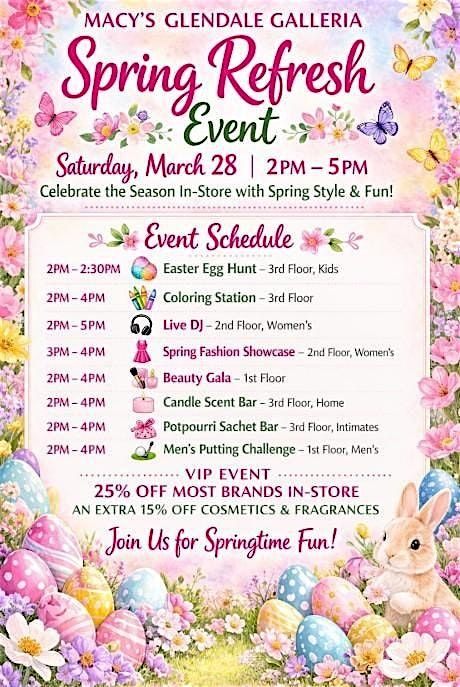 Join us at Macy’s Glendale for our Spring Refresh Event, a special Friends & Family experience designed to help you step into the new season with confidence and style. Enjoy 25% off your favorite looks while exploring curated spring fashion, interactive in-store experiences, and personalized styling moments. It’s the perfect opportunity to refresh your wardrobe and embrace a new season of you.