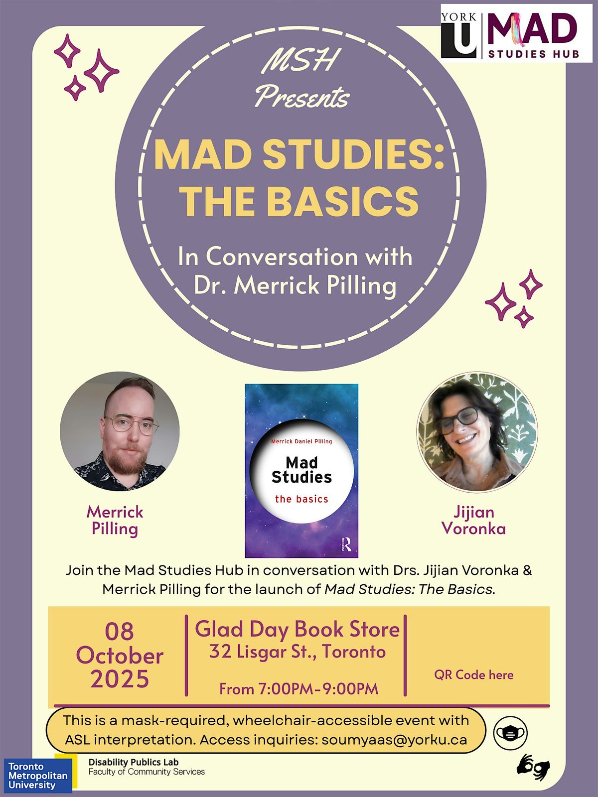 The Mad Studies Hub invites you to join us for the launch of Mad Studies: The Basics, featuring a conversation between Dr. Merrick Pilling and Dr. Jijian Voronka, moderated by Dr. Chris Chapman. This is a mask-required event being held at Glad Day’s new location on Lisgar Street. This event is co-sponsored by the Disability Publics Lab at Toronto Metropolitan University.