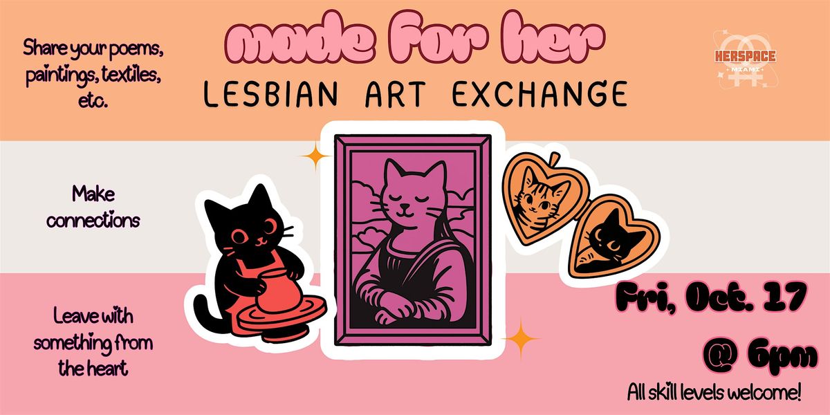 🎁 Bring a poem, painting, sketch, zine, textile, photo, collage, etc. — anything you’ve created with care. At the end of the evening, we’ll swap creations and everyone goes home with a heartfelt gift made by another lesbian! 💖