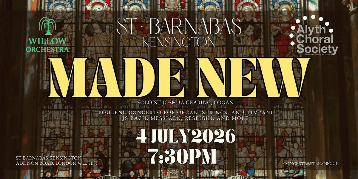 A Celebration of the 1856 Walker Organ, marking the inaugural concert of the newly restored historic instrument at St Barnabas, Kensington. This special evening brings together Joshua Gearing, the Willow Orchestra, and the Alyth Choral Society for a vibrant programme centred on Poulenc’s Concerto for Organ, Strings, and Timpani, alongside works by JS Bach, Messiaen, Respighi, and more.