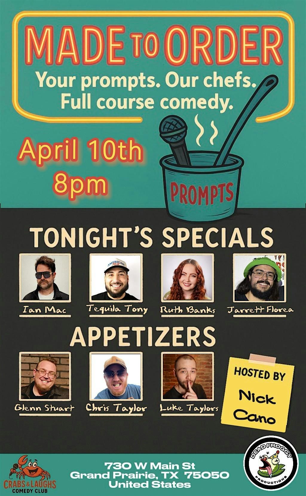 This show will be held at Crabs and Laughs Comedy Club, located upstairs in Mariscos La Reyna #7. It is sure to be a great nights of laughs and good food!