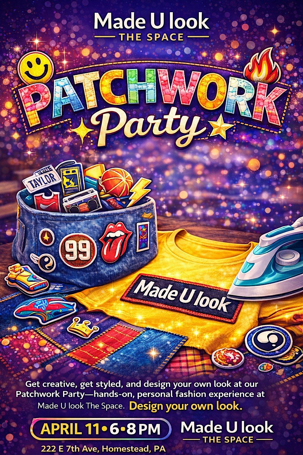 Get creative, get styled, & design your own look at our Patchwork Party. A hands on custom fashion experience at Made U look "The Space " A hands on experience where you & customize your own look with patches, & custom details