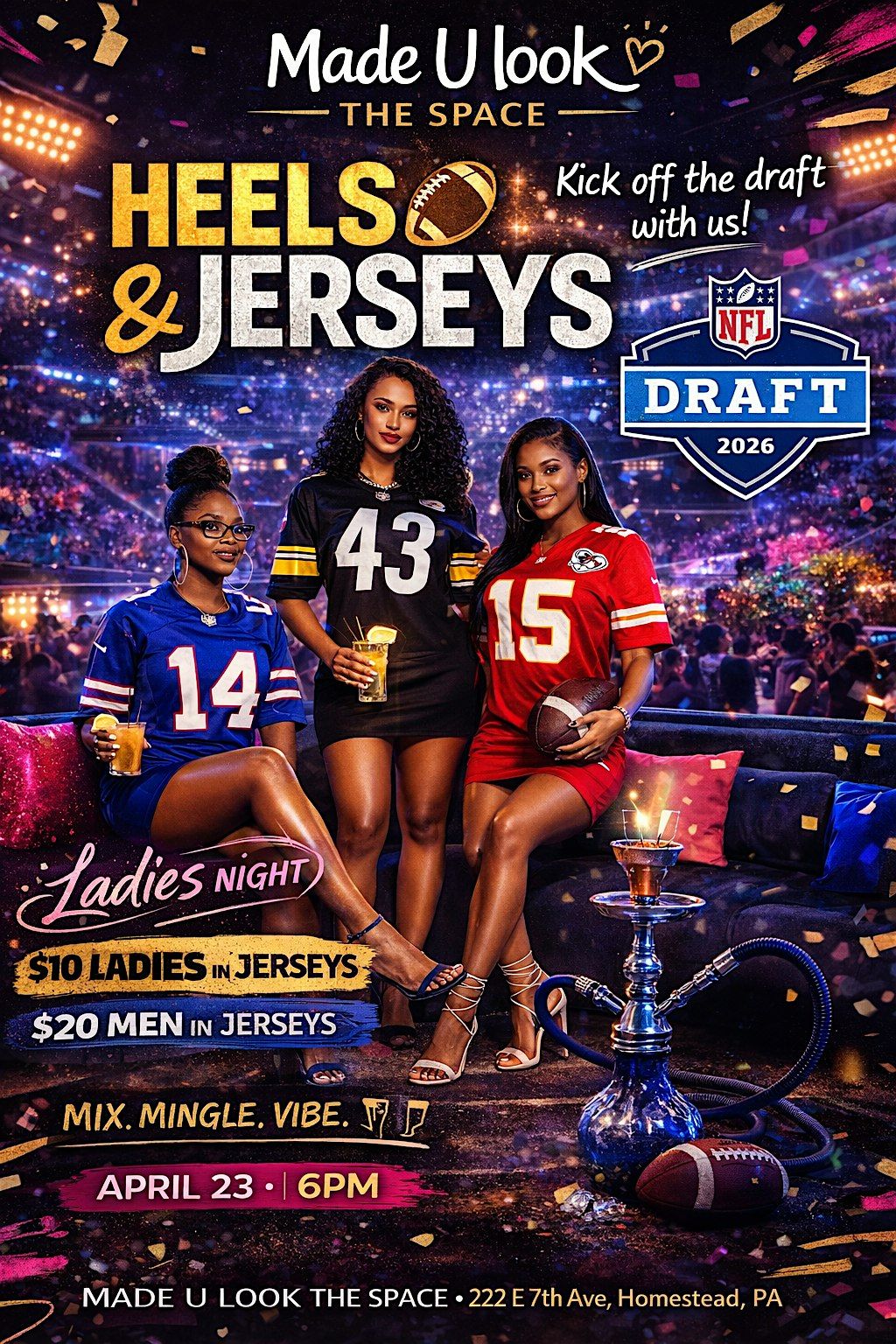 Kick off the NFL Draft with us Heels & Jerseys- A ladies Night with a sporty twist. Ladies Pull up in your favorite jersey & your best heels- fellas show up in your favorite jersey for a night of music, drinks, & high-energy vibes while we watch the draft & celebrate the moment. Whether you're coming to vibe, show off your look, or connect with others, this is the place to be! Mix! Mingle! Vibe.