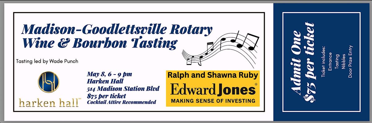 Join the Madison-Goodlettsville Rotary Club for an evening of delicious hors d’oeuvres, live music from Ron Crites, and wine and bourbon tasting in the beautiful lobby of Harken Hall!