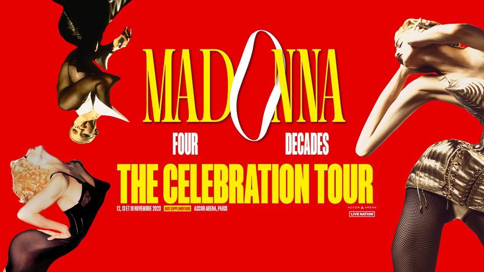 Madonna : The Celebration Tour ! 4 décennies de musique - ses plus grands titres en live à l’Accor Arena les 12, 13 & 19 novembre 2023 ! Prévente Live Nation jeudi 19 janvier à 10h et mise en vente vendredi 20 janvier à 10h.