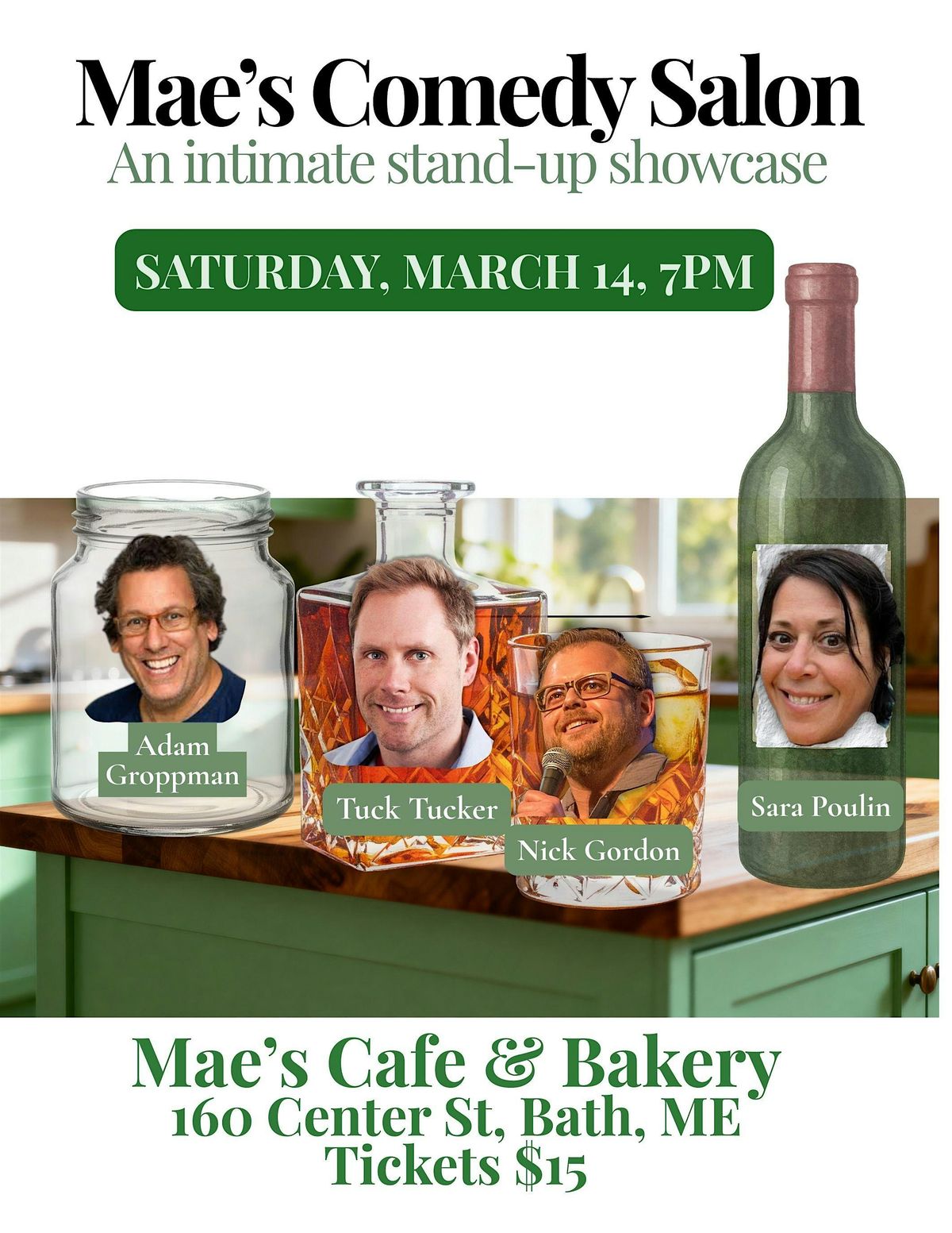A curated standup comedy showcase in the intimate, upstairs level of Mae's Cafe & Bakery, a favorite food, coffee & social spot for the entire Midcoast region.