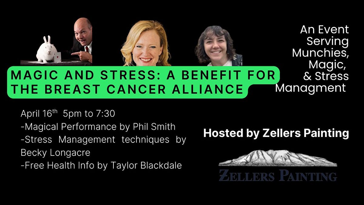 Join us in person for a fun event filled with magic and stress management techniques, all while supporting the Breast Cancer Alliance. Phil Smith , our local celebrity Magician will open with some entertainment, laughter and magic. Becky Longacre will lead you in some simple meditation and Yoga to de-stress. And Taylor Blackdale will give you some free resources on health and supplemental insurance. We will then have some time for refreshment and socialization.