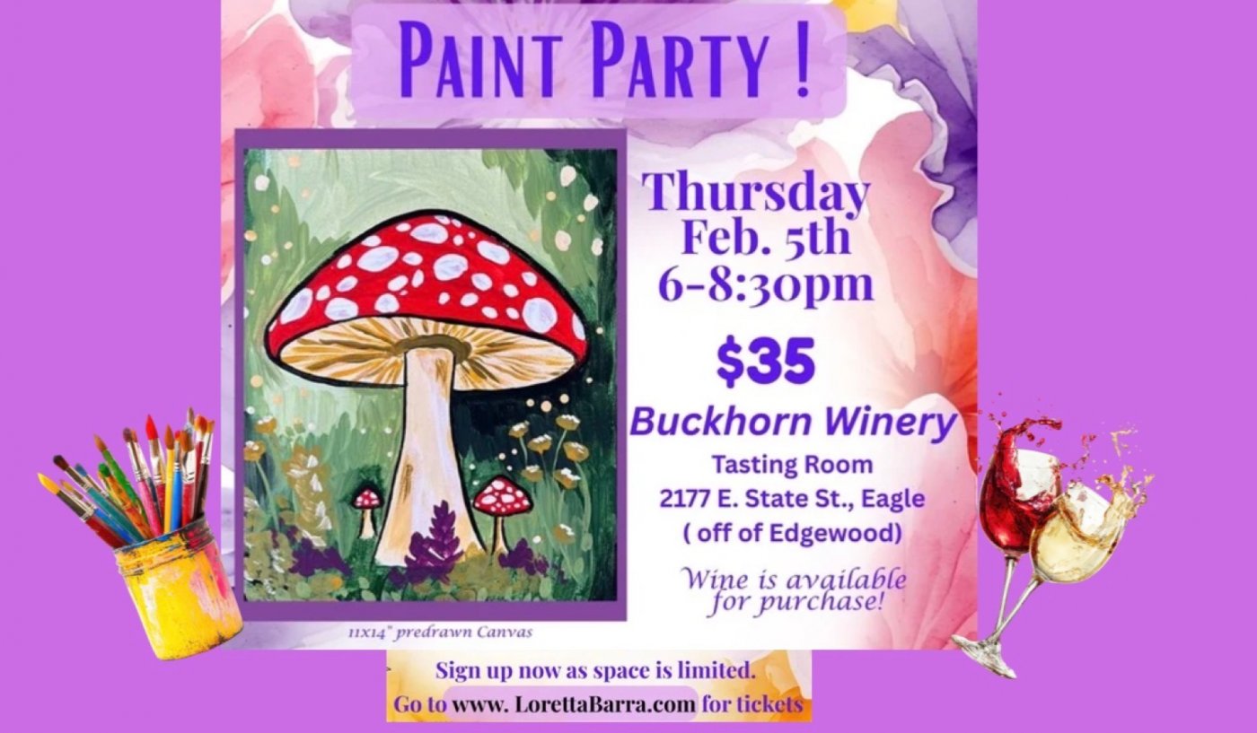Buckhorn Winery is a wonderful venue in Eagle where you may purchase a glass of wine or a bottle to bring home. We will begin painting at 6:30pm but feel free to come at 6pm and have a glass of wine or just come and relax. Minors are welcome as we are not going to be in the wine tasting room... but in the back room where they actually bottle their wines at harvest time! It will be a fun evening.