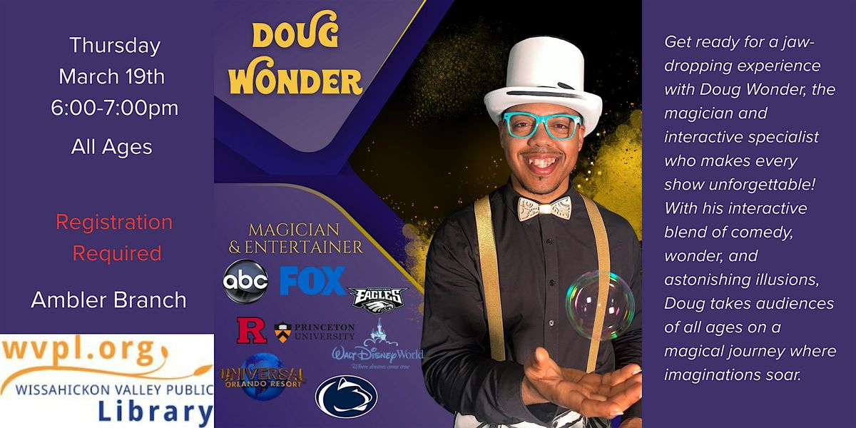 Get ready for a jaw-dropping experience with Doug Wonder, the magician and interactive specialist who makes every show unforgettable! With his interactive blend of comedy, wonder, and astonishing illusions, Doug takes audiences of all ages on a magical journey where imaginations soar. All Ages. Please register everyone in your party.