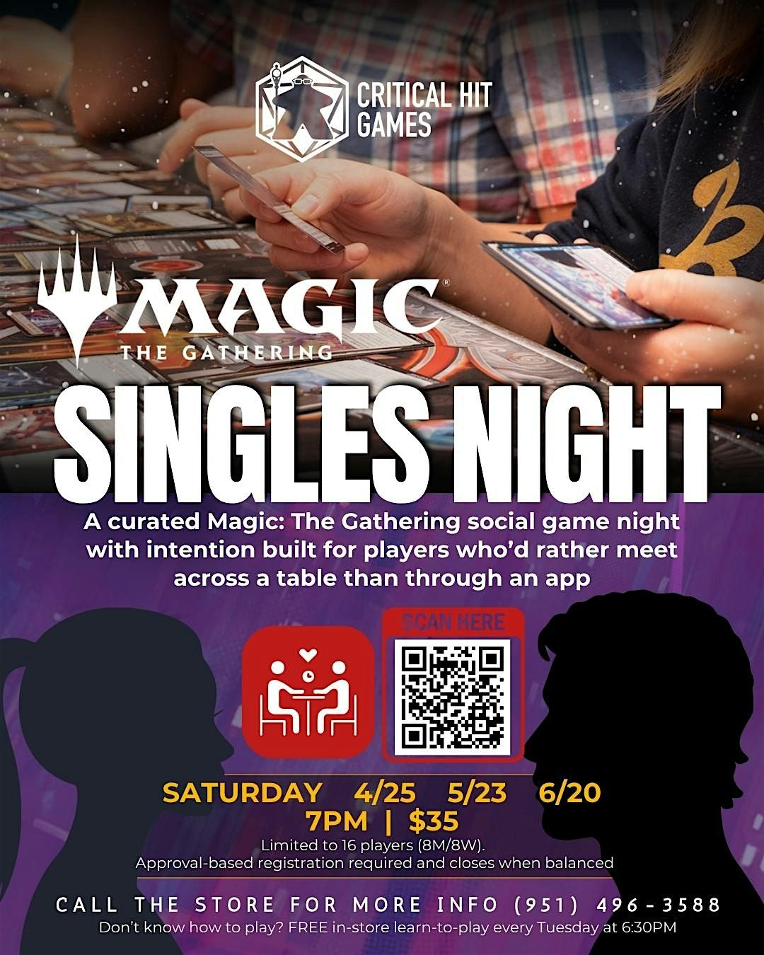 We’re hosting Commander Singles Nights, a structured, social Magic: The Gathering speed dating-ish experience designed to help you meet new people while actually enjoying the game. This isn’t a tournament. It’s a hosted night of rotating Commander pods, relaxed conversation, and intentional connection.