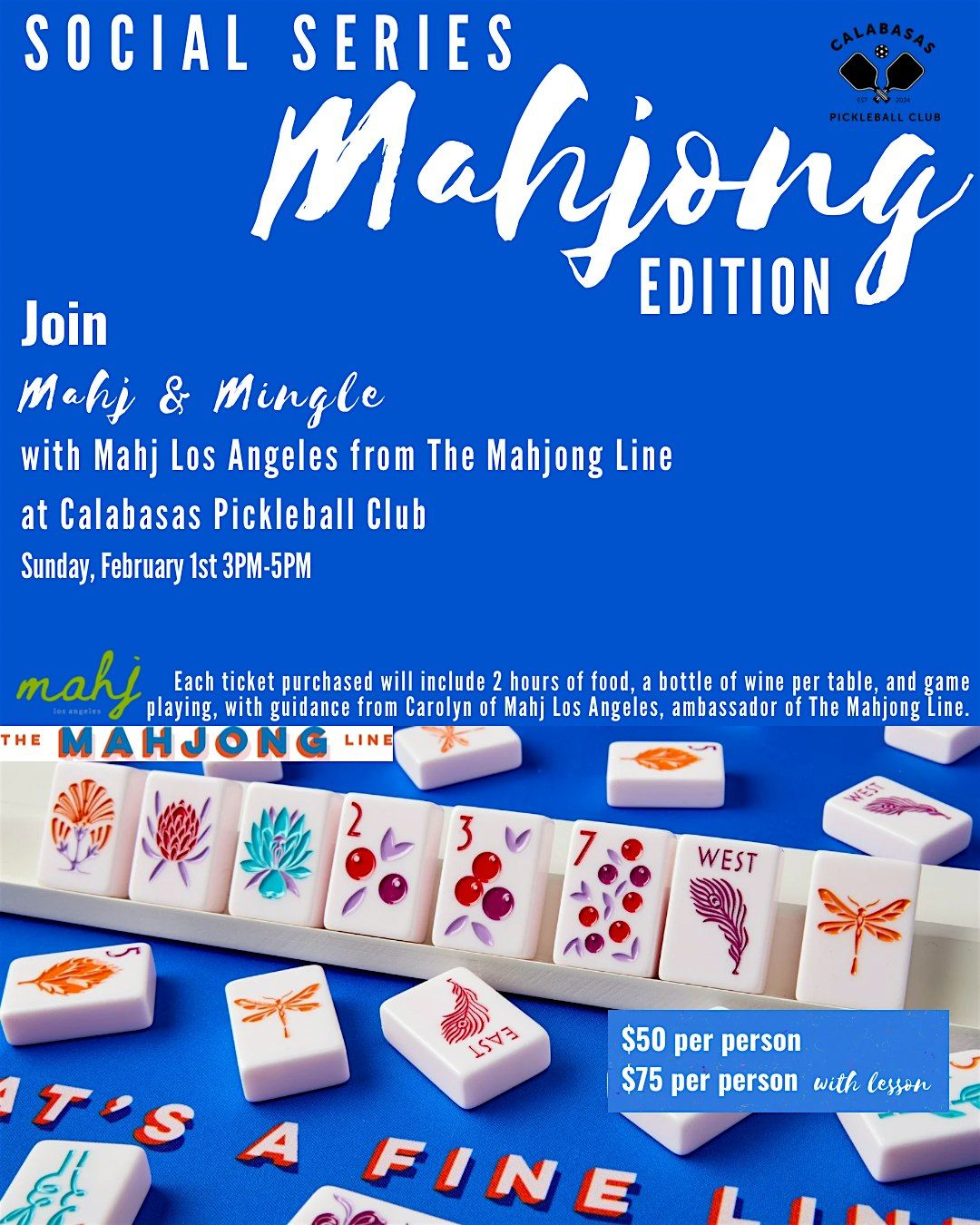 Join us for an elevated afternoon of tiles, wine, and connection at Calabasas Pickleball Club as our Social Series continues with a Mahjong Edition in partnership with Mahj Los Angeles and The Mahjong Line.