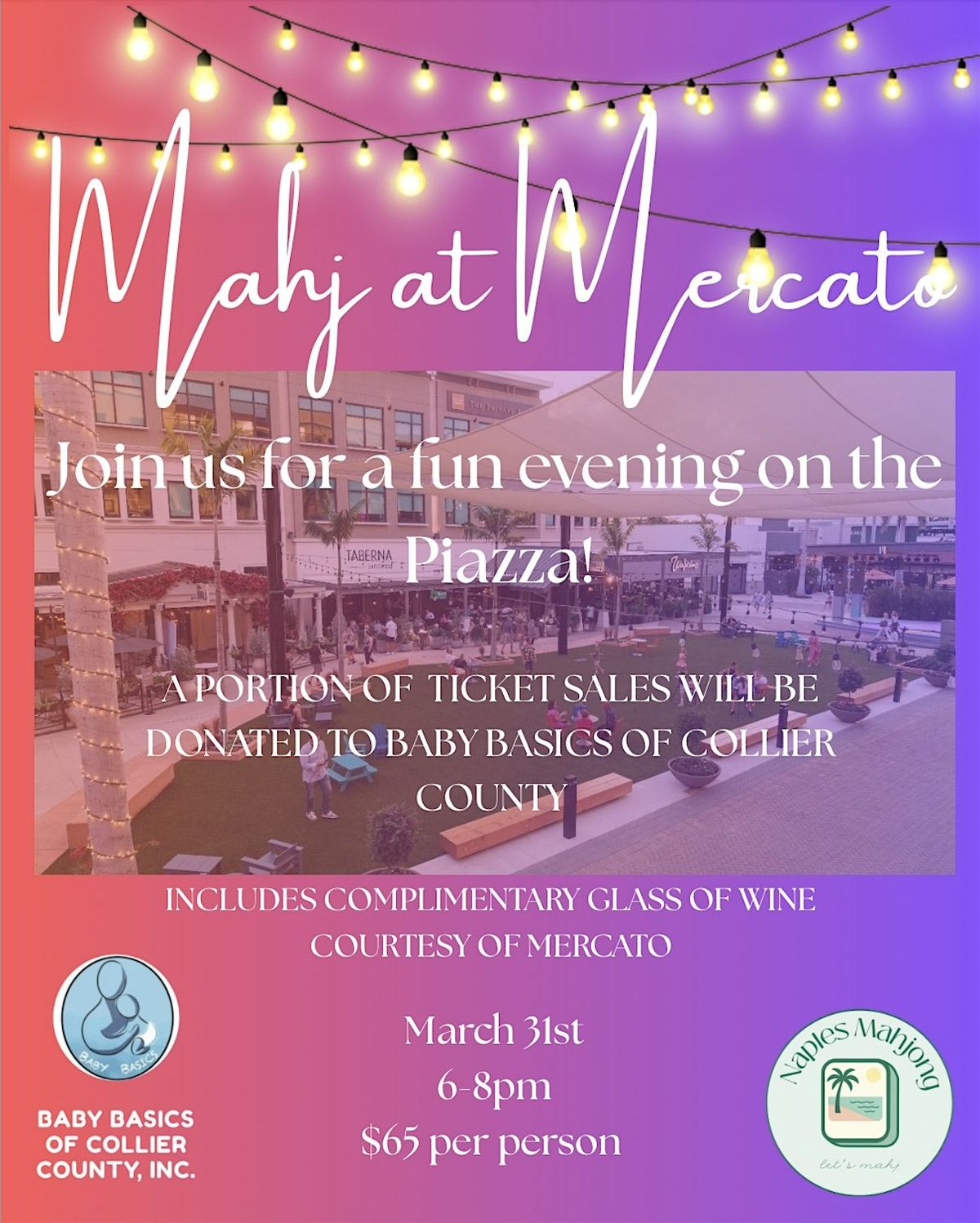 Join us for a fun evening on the Piazza at Mercato, a portion of ticket sales will be donated to Baby Basics of Collier County. Each attendee will receive a complimentary glass of wine courtesy of Mercato.