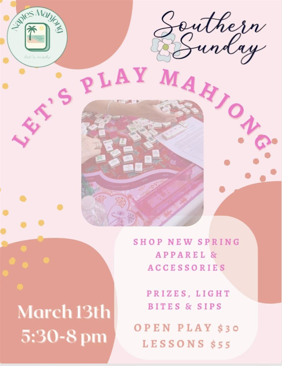 We’re back at one of our favorite Naples destinations ✨ Join us for mahjong at Southern Sunday, with open play and lessons available—set among all the beautiful spring pieces throughout the store. We can’t wait to mahj with you.