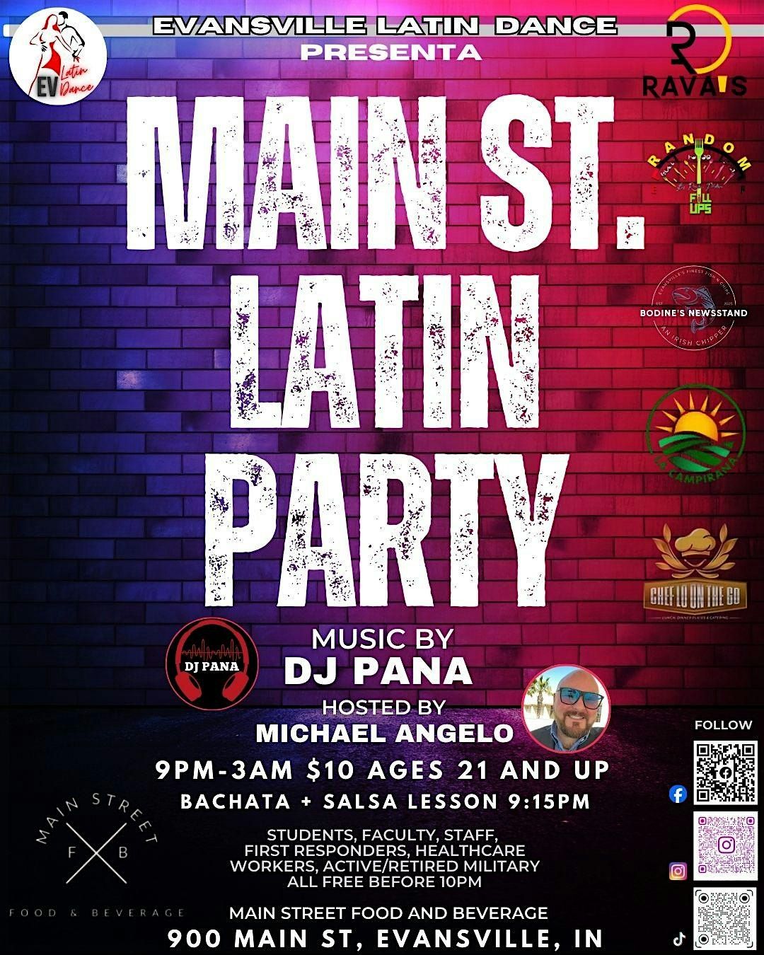 Evansville Latin Dance & EvLD Promotions proudly present the return of our Main Street Latin PartyNew year, same amazing vibe.The Night Begins EventBrite tickets dont count. $10 at ther door. EventBrite tickets dont count.