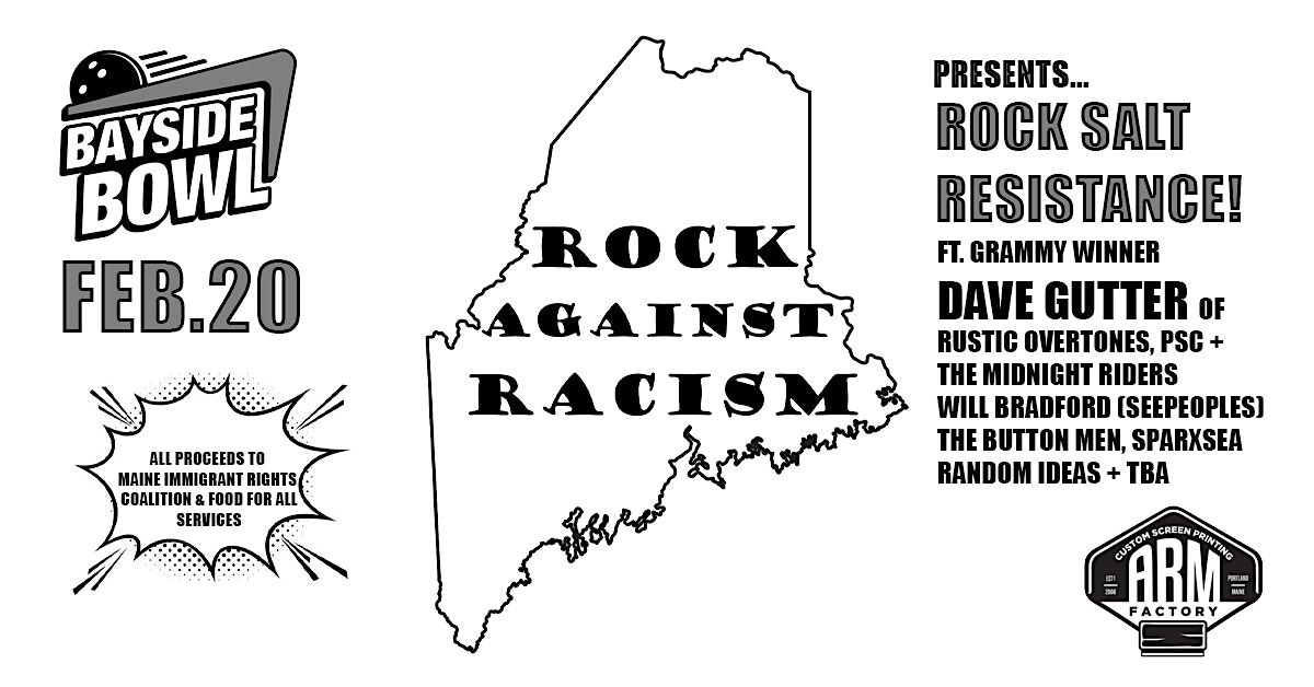 Bayside Bowl & Necessary Music Productions are excited to announce the Rock Salt Resistance! concert hosted by Maine Rock Against Racism on Friday February 20th! This event will serve as a positive example of community in action against Federal overreach & aggression against our communities & will directly benefit the Maine Immigrant Rights Coalition & Food For All Services which has been coordinating food deliveries to our neighbors who have been home bound during the most recent surge of Federal immigration raids in Maine.