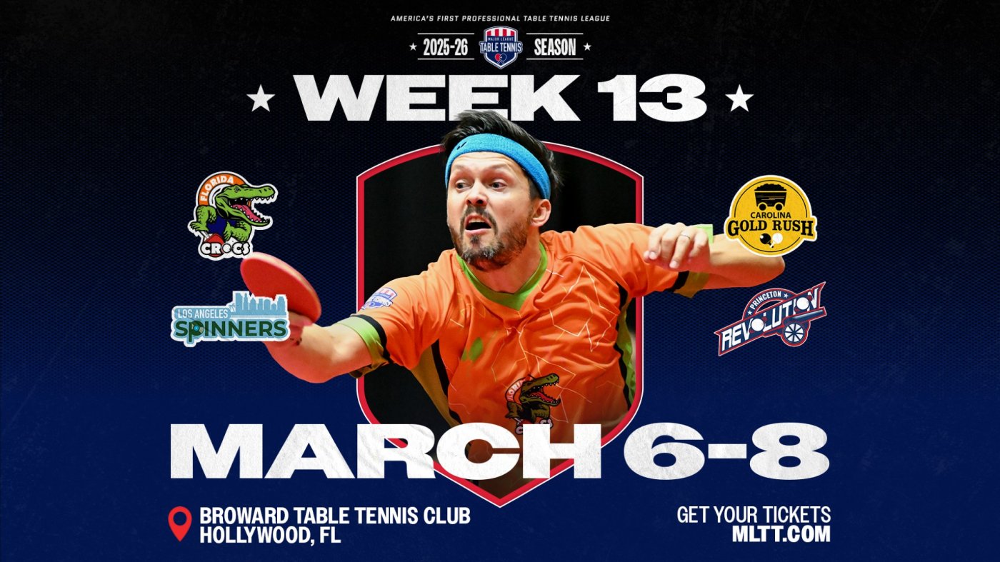 Major League Table Tennis heads back to Hollywood, FL, for WEEK 13: Mar. 6–8, 2026, at the Broward Table Tennis Club. The Florida Crocs defend their home court against the Los Angeles Spinners, Carolina Gold Rush, and Princeton Revolution.