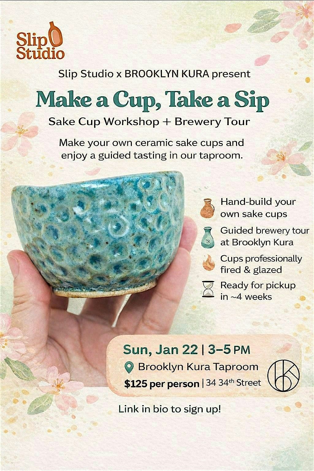 Join Slip Studio and Brooklyn Kura for a unique, hands-on experience celebrating craft, culture, and sake. In this guided workshop, guests will hand-build their own ceramic sake cups under the instruction of Slip Studio's Ariella Toeman, learning fundamental techniques in clay while creating a functional piece to later pick up and take home.