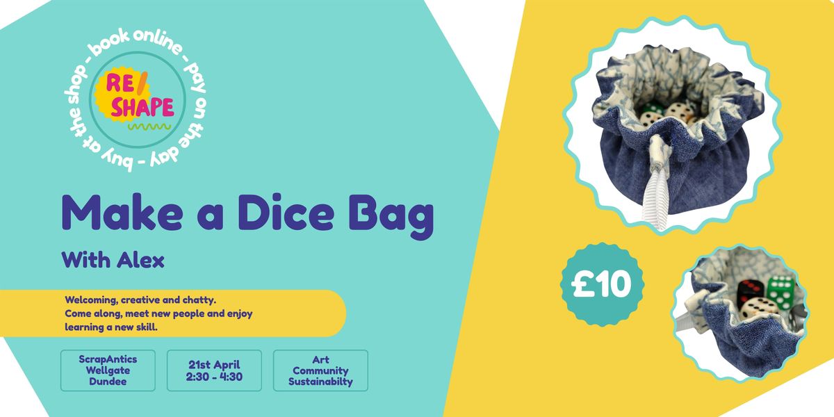 Come along to ScrapAntics and meet Alex, who will carefully guide you through the process of making your own games dice bag. You’ll choose your fabric from a selection of sustainable materials, learn how to cut your pattern, and sew a drawstring into your design.