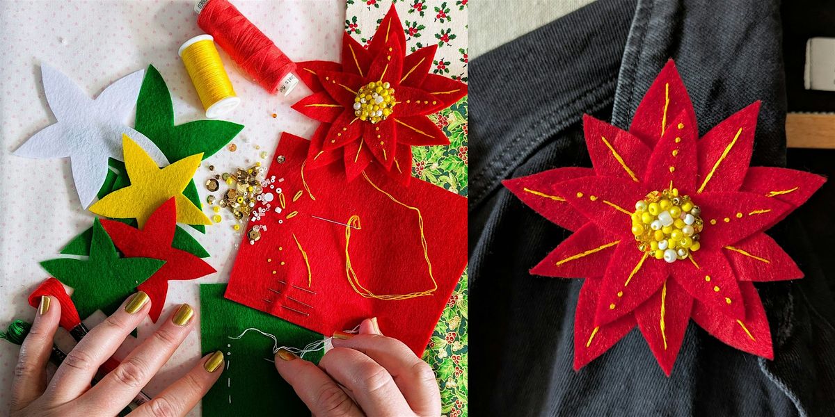 Join renowned textile artist Frockdolly to create your own embroidered poinsettia, which can either be worn as a brooch or hung as a decoration. You'll choose your own festive colour combination and be guided step-by-step through the process of adding embroidery stitches and beads, making your piece completely unique.