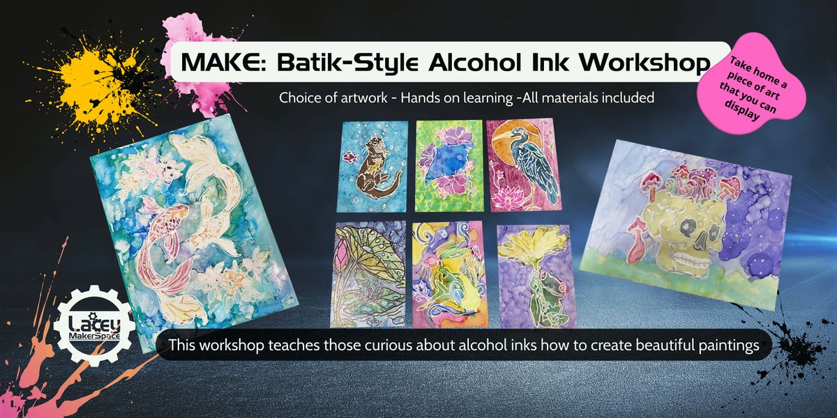 Discover the magic of batik-inspired alcohol ink painting in this guided, three-hour creative workshop at Lacey Makerspace! You’ll learn how to use vibrant alcohol inks combined with a wax-resist technique to create striking, colorful artwork that radiates with life.
