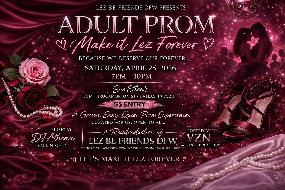 Grown, sexy queer prom. Lez Be Friends DFW is BACK! Join us April 25 @ Sue Ellen’s for music, vibes & $5 entry.