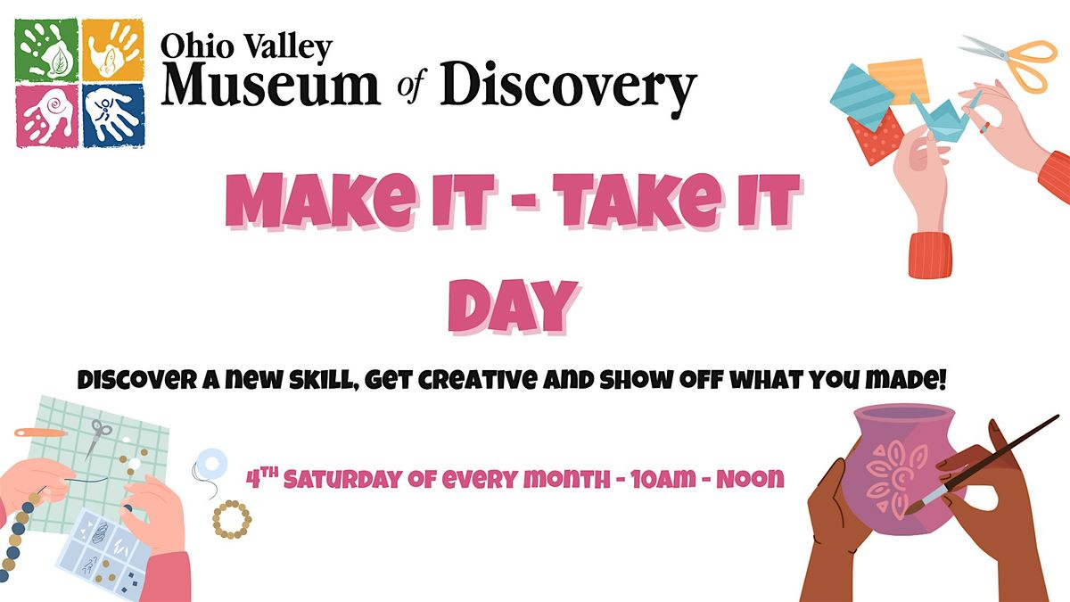 Join us on the 4th Saturday of every month to discover a new skill, get creative, and show off what you made! Our Make It-Take It Days focus on the "A" in STEAM - Art, and the activities relate to our monthly themes.