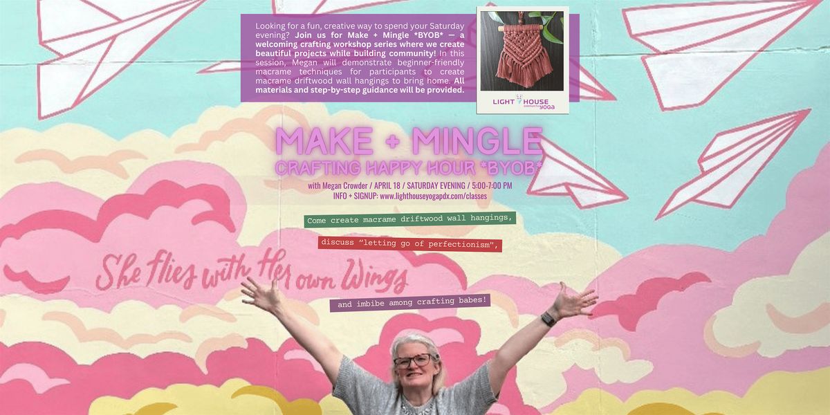 Looking for a fun, creative way to spend your Saturday evening? Join us for Make + Mingle *BYOB* — a welcoming crafting workshop series where we create beautiful projects while building community! Megan will demonstrate beginner-friendly macrame techniques and participants will work on a craft project to bring home.