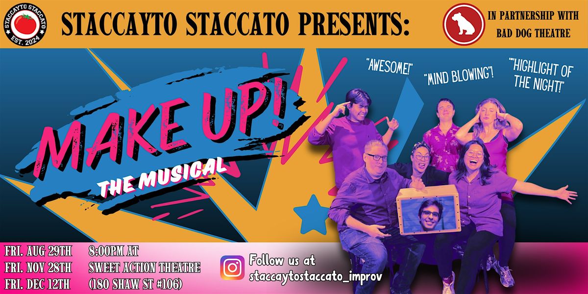 Staccayto Staccato (pronounced like "To-may-to To-mah-to") is a Toronto-based musical comedy troupe featuring performers from the schools and stages of Bad Dog Theatre, Comedy Bar, Second City, and more! Their high-energy blend of humour and music earned them the prestigious "Big Buzz" award at the Guelph Fringe Festival 2024 with their show “Make Up! The Musical”, and they’re bringing it to Sweet Action Theatre! Get ready for tunes, feels, and laughs!