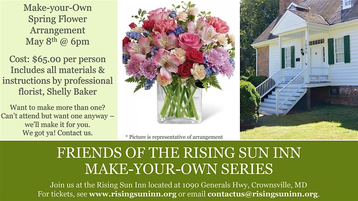 Join the Friends of the Rising Sun Inn for a Make-Your-Own Floral Arrangement workshop just in time for Mother's Day on Friday, May 8, 2026, at 6PM at the Historic Rising Sun Inn located at 1090 General’s Highway, Crownsville. This a popular event and will fill up fast!