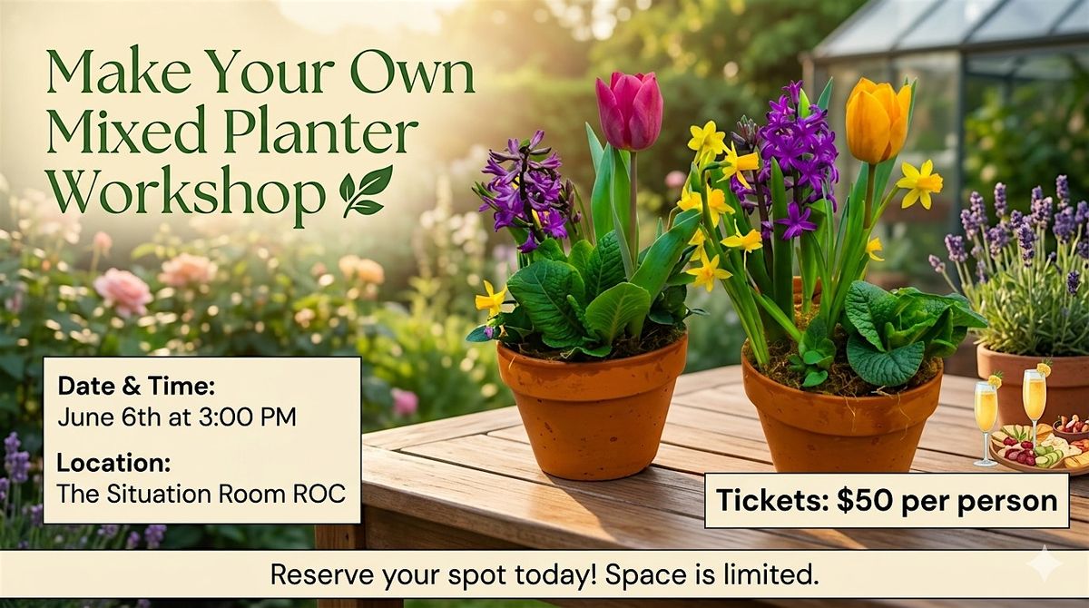 Join us at The Situation Room ROC on June 6th at 3 PM to create your own beautiful mixed planter! We’ll provide all the materials you need, including one clay pot and your choice of 3–4 plants to design your perfect arrangement.