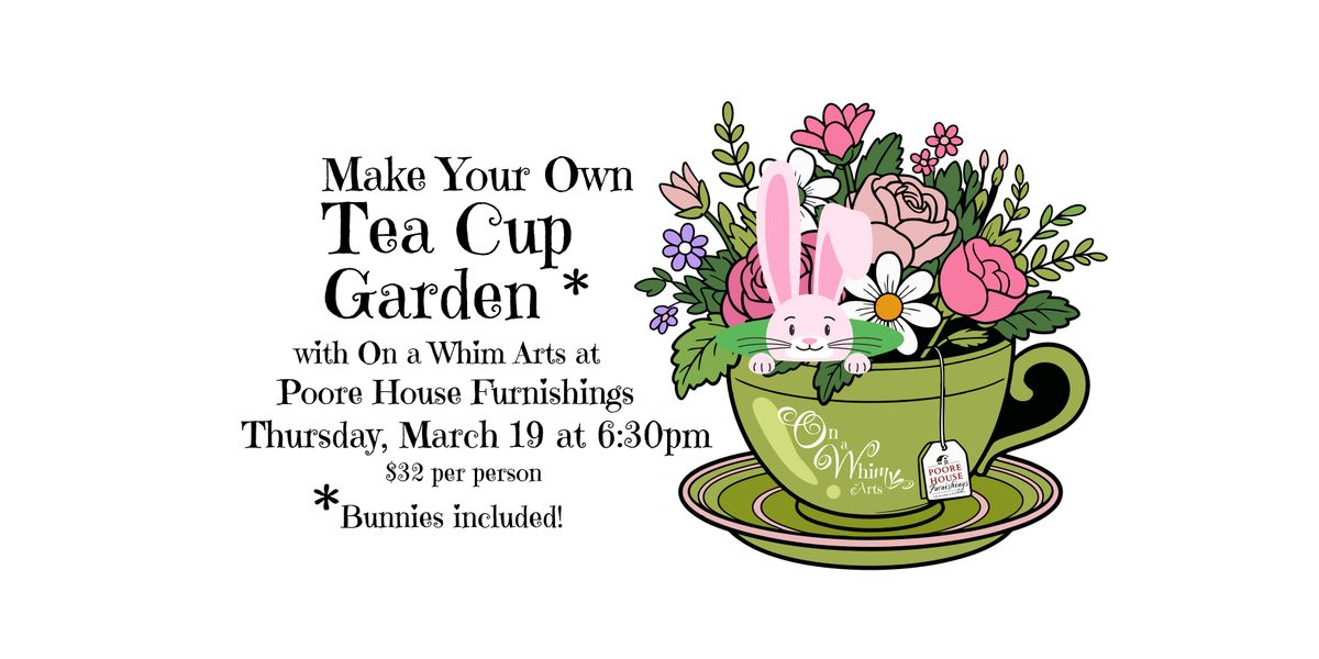 Create your own little garden in a tea cup (or creamer or other small piece of china) with artifical flowers, and other nature inspired details, including a itty bitty bunny! We’ll have all of supplies but if you have a special tea cup that you'd like to use please bring it. Also BYOB. Light snacks will be provided. you are welcome to bring your own tea cup.