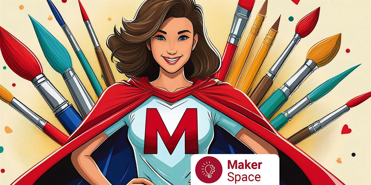 [Image Description: An illustration of a female superhero surrounded by painbrushes. She wears a red cape and a capital 'M' is featured on the front of her shirt. Text reads Maker Space. ]