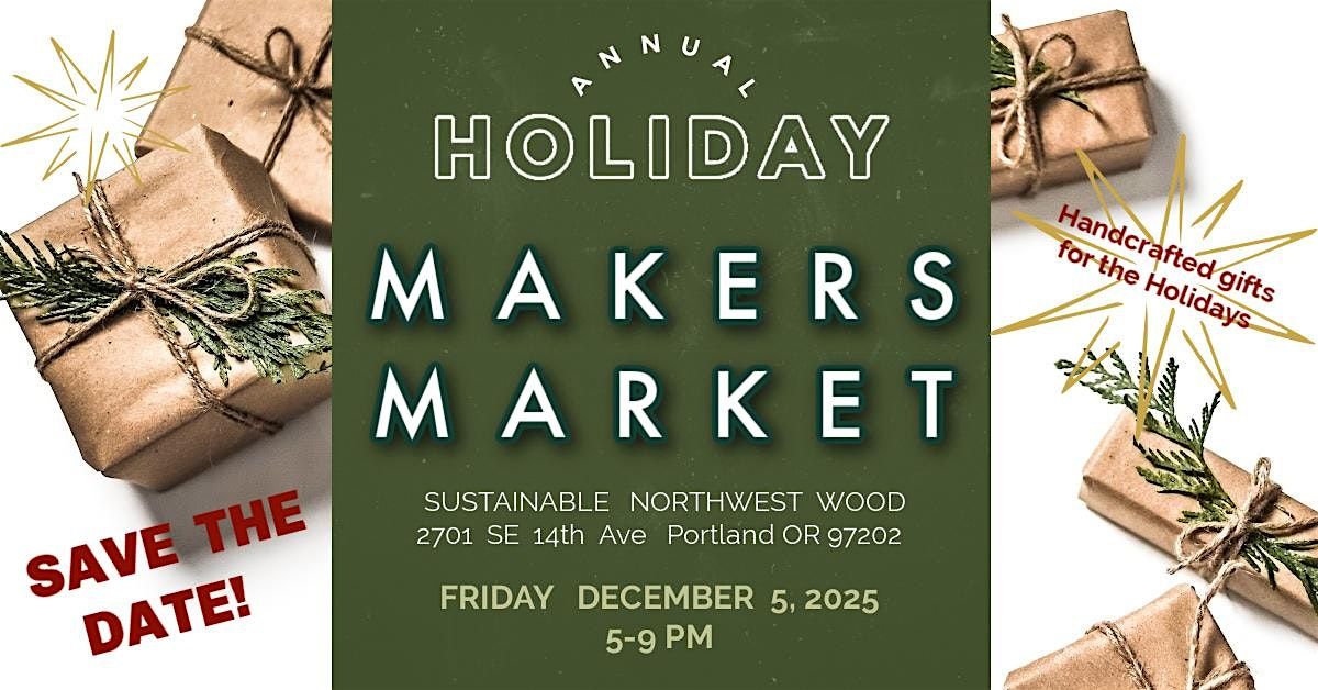 FRIDAY DECEMBER 5th 2025 5-9 PM, join Sustainable NW Wood and more than 25 local artisans in our open air wood warehouse turned MAKER Wonderland. This event is FREE to attend, as our gift to our amazing community.