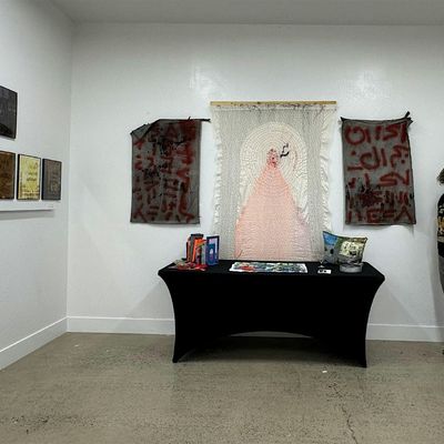 Image description: Liz Awesome standing in his exhibit, Solidarity As An Art Supply in the gallery space at Flower Fist Art Market.