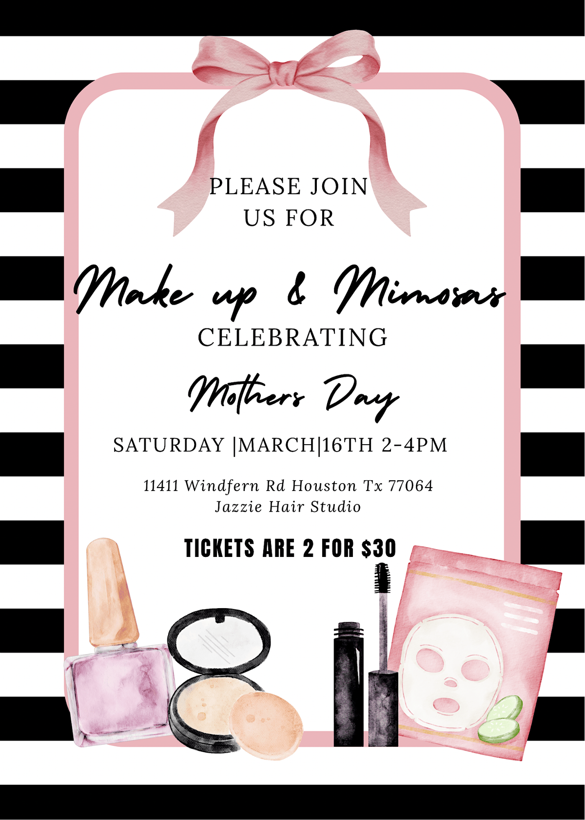 Tickets are available for two guests for $30, making it the perfect opportunity to bring your mother, daughter, or a friend and enjoy the experience together. Located at Jazzie Hair studio
