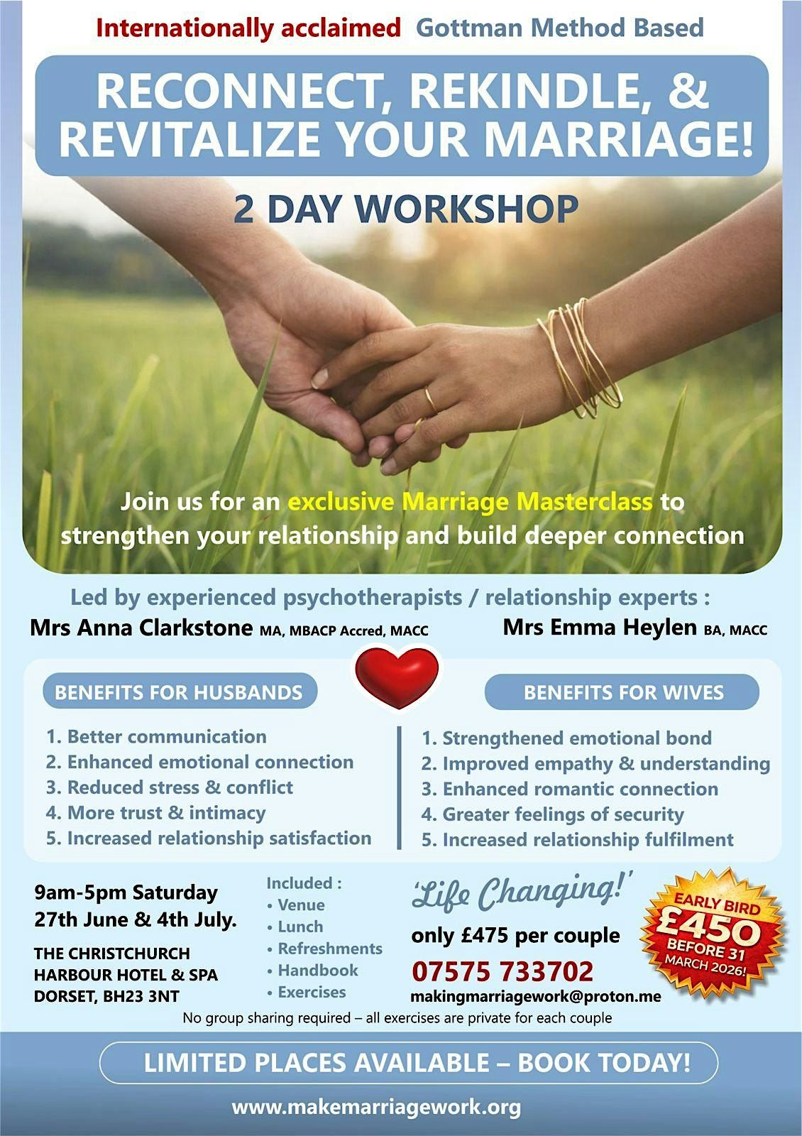 Join us for a fun and interactive 2-day workshop at the Harbour Hotel Christchurch. Over 2 days n June 27 & 4 July, 2026 from 9am-5pm (BST), you'll learn practical tools to strengthen your relationship using the Gottman Method. Whether you're newlyweds or have been together for years, this event is designed to help you connect and communicate better. Don’t miss out on this chance to make your marriage work in a relaxed and friendly setting!