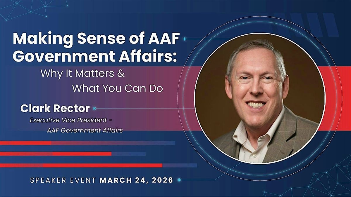 Join us for our 5th speaker event of our 2025-26 season, "Making Sense of AAF Government Affairs: Why It Matters and What You Can Do" with Clark Rector, Executive Vice President - Government Affairs with AAF.