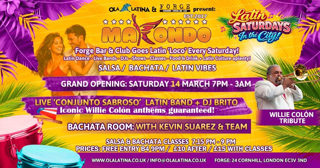 'MAKONDO' LATIN SATURDAYS IN THE CITY! From SATURDAY 14th MARCH. We launch this new Latin Club Night experience with a special WILLIE COLÓN TRIBUTE!Salsa, Bachata and Latin Beats in the City Every Saturday! 7 pm to 3 am