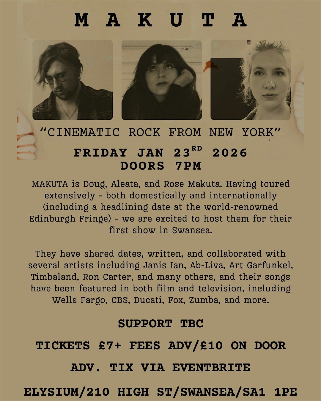 MAKUTA is Doug, Aleata, and Rose Makuta. Having toured extensively - both domestically and internationally (including a headlining date at the world-renowned Fringe Festival in Edinburgh, Scotland on August 2025) - we are excited to host them for their first show in Swansea.