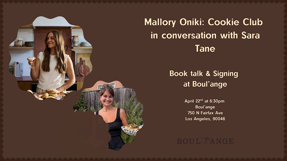 - A signing will follow the talk between Mallory and Sara, accompanied by a "Cookie Happy Hour" where guests can mingle and sample some cookies from the book. Drinks will be available for purchase through Boul'ange.