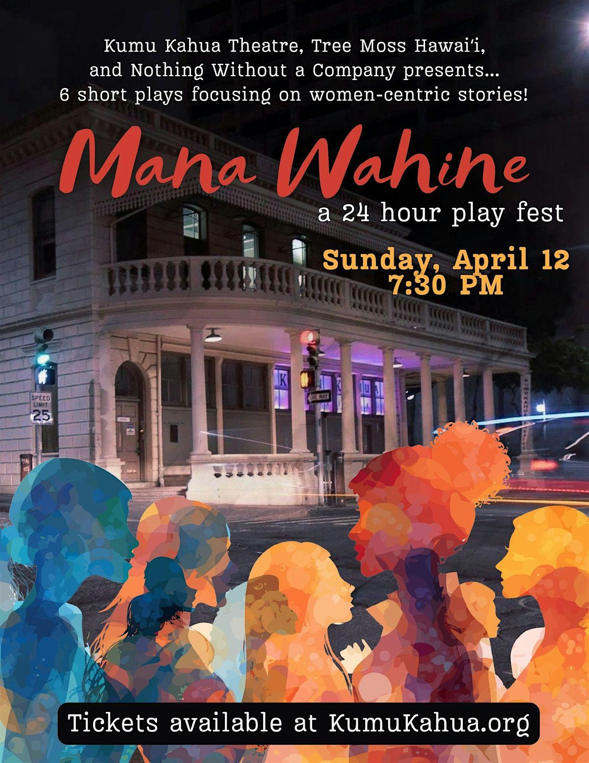 Kumu Kahua Theatre, Chicago's Nothing Without a Company & Hawaiʻi's playwright collective: Tree Moss Hawaiʻi are thrilled to co-produce 6 new 10 minute plays together for the 1st time! This fast-paced 24-Hour Play Festival will bring together 30 Hawaii artists to create 6 original short plays in just 1 day, focusing on women-centric stories by bringing women to the front!