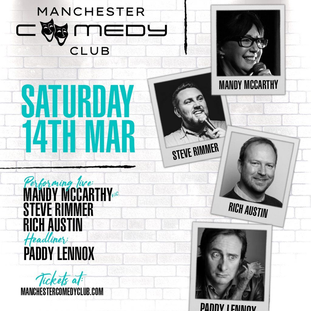 Manchester Comedy Club - 14 March 2026Steve Rimmer, Rich Austin, headliner Paddy Lennox. MC Mandy McCarthy, hostess Charli Angel.