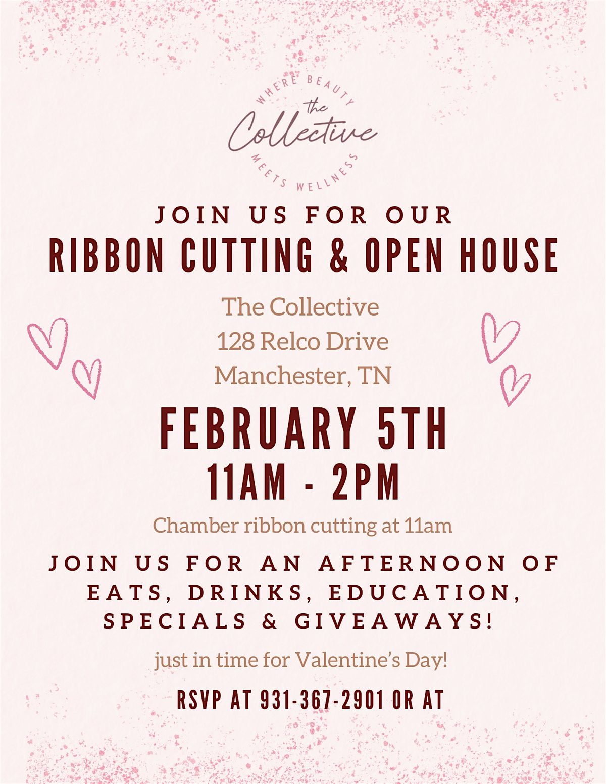 Join us for a fun and festive Ribbon Cutting & Open House Celebration at The Collective in Manchester, TN! We’re so excited to welcome the community, meet new faces, and celebrate this exciting new chapter—just in time for Valentine’s Day