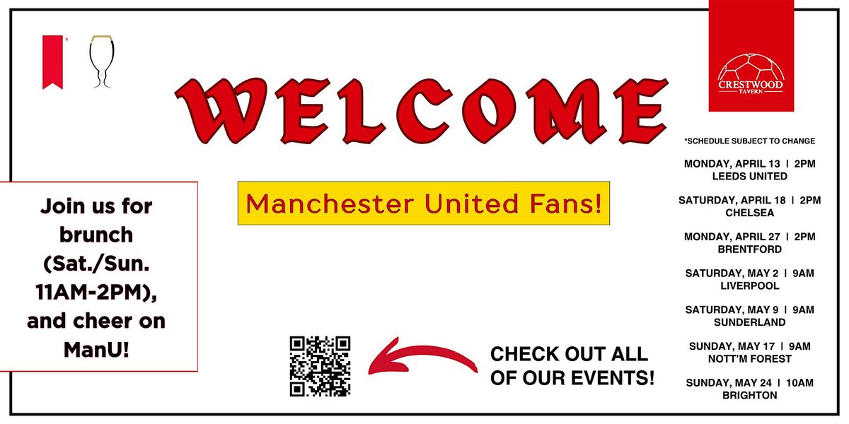 Join us at Crestwood Tavern to cheer on ManU! (Brunch is available on Saturdays and Sundays from 11am-2pm.)